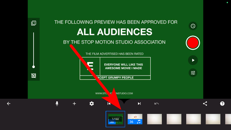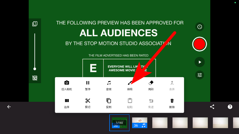 2、進(jìn)入拍攝界面后,點(diǎn)擊右側(cè)紅色拍攝按鈕,逐幀拍攝畫面每調(diào)整一次物體位置就拍一幀。