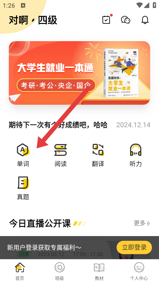 1、在首頁(yè)點(diǎn)擊單詞,進(jìn)入背單詞板塊,可開始四級(jí)高頻詞的學(xué)習(xí)。