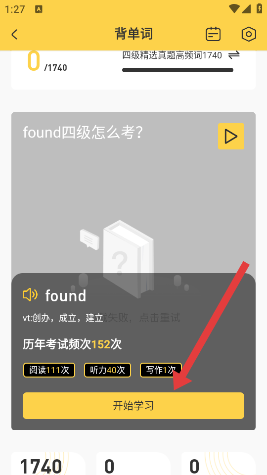 2、在背單詞的頁(yè)面,需要點(diǎn)擊開始學(xué)習(xí),進(jìn)入單詞學(xué)習(xí)的流程。