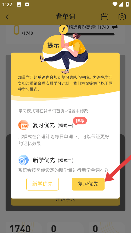 3、在選擇彈窗中,可以選擇復(fù)習(xí)優(yōu)先,制定適合自己的學(xué)習(xí)計(jì)劃。