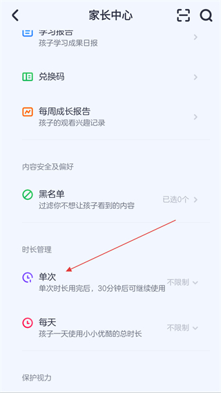 1、打開優(yōu)酷少兒的APP,進(jìn)入時(shí)在時(shí)長(zhǎng)管理下點(diǎn)擊單次的按鈕。