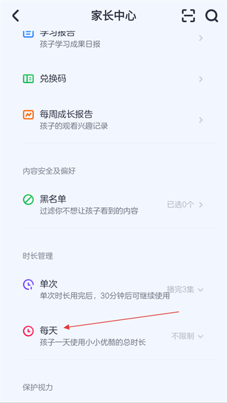 3、點(diǎn)擊后返回家長(zhǎng)中心,再次在時(shí)長(zhǎng)管理下,點(diǎn)擊每天的按鈕。