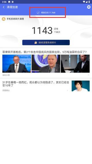 4、清理后,頁面會呈現(xiàn)釋放空間77.7MB的內存。