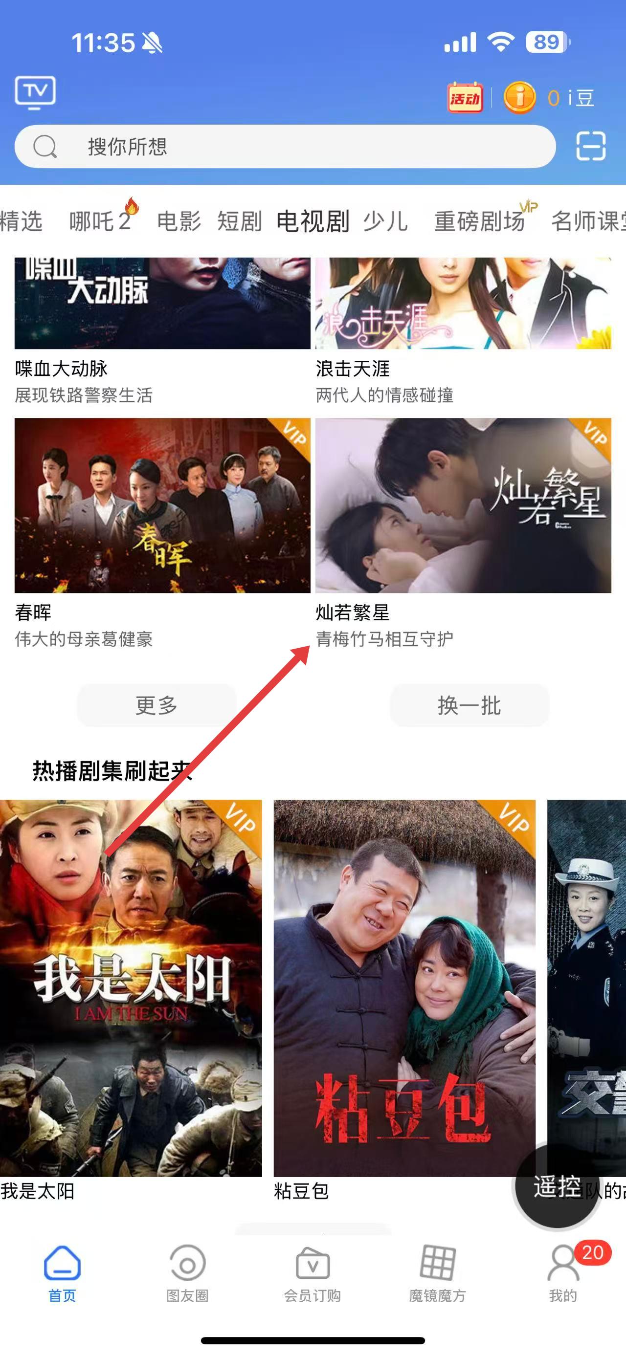 1、打開i視APP,在首頁的精選等欄目中,選擇想要投屏觀看的電視劇,例如燦若繁星。