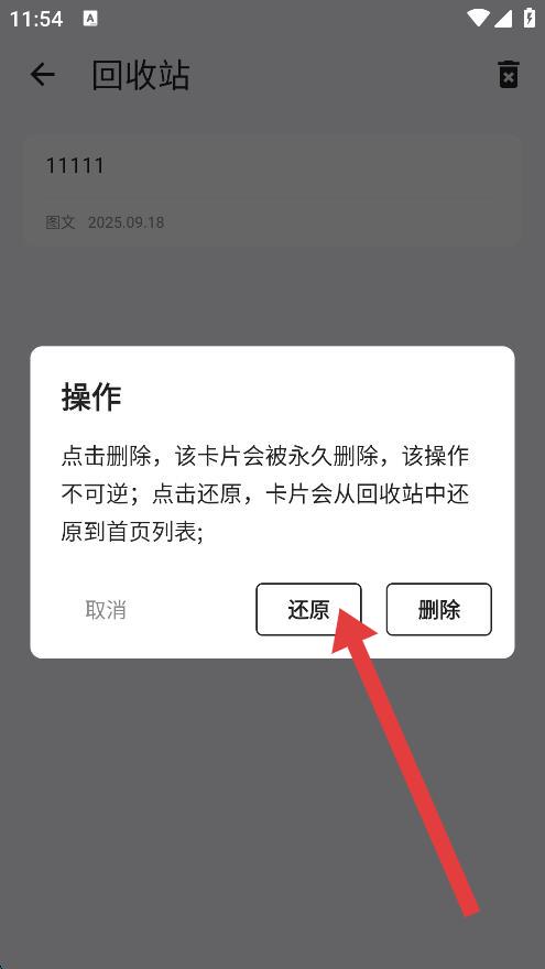 4、點(diǎn)擊筆記后,會(huì)彈出操作提示框,點(diǎn)擊其中的還原按鈕,即可恢復(fù)內(nèi)容。