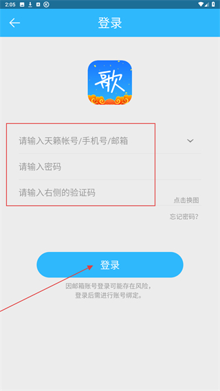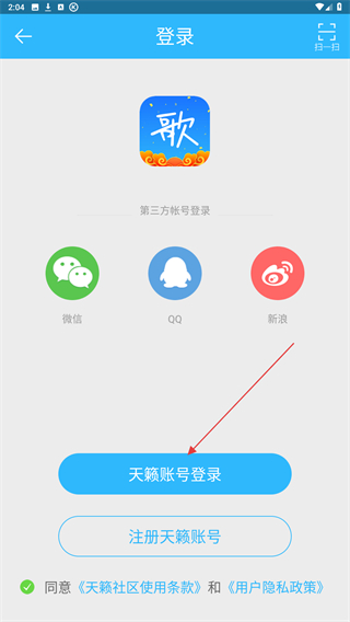 3、進(jìn)入登錄的頁面內(nèi),用戶需選擇并點(diǎn)擊天籟賬號登錄的按鈕。