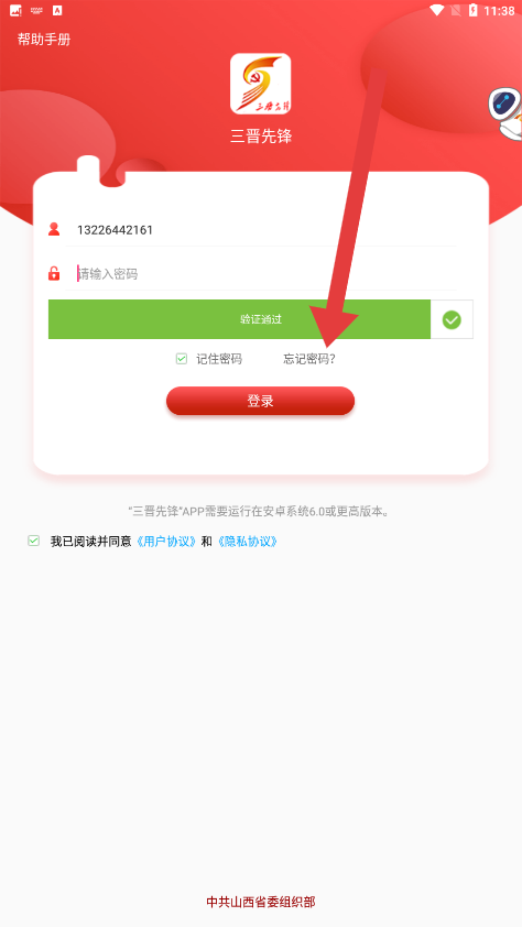 1、在三晉先鋒登錄頁(yè)面中,若忘記密碼可以點(diǎn)擊下面的忘記密碼按鈕解決。