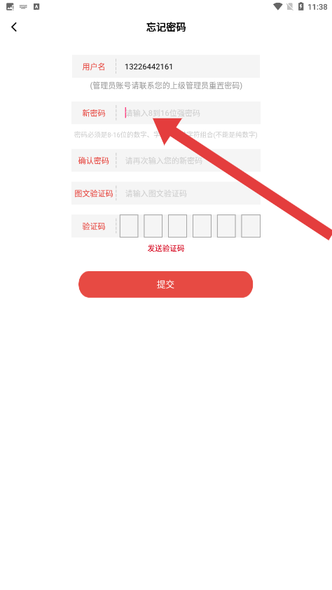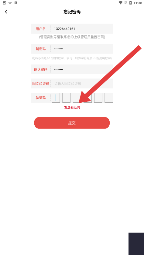 3、在輸入完信息后,點(diǎn)擊發(fā)送驗(yàn)證碼按鈕,獲取后完成重置密碼操作。