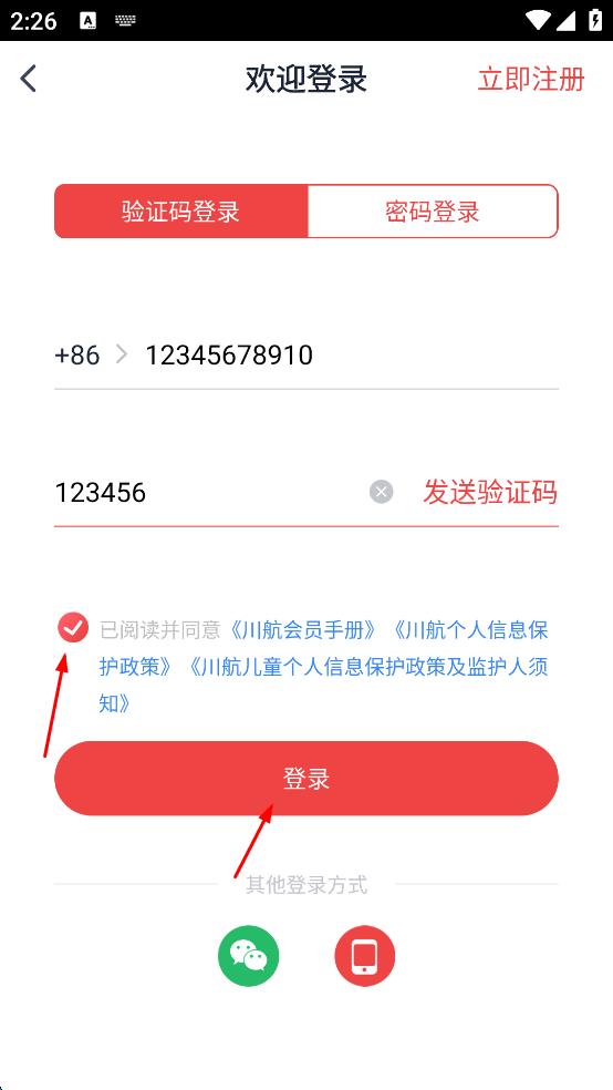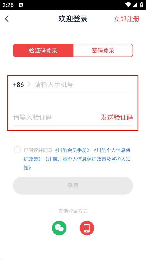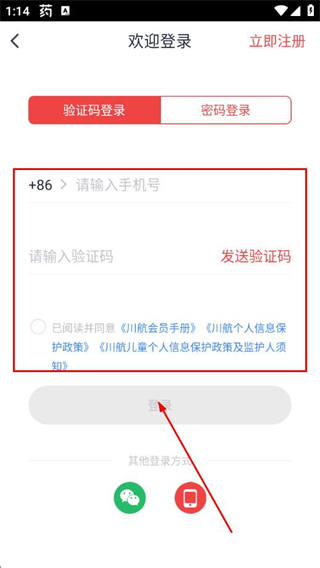 3、在歡迎登錄界面,選擇驗證碼登錄方式,輸入手機號碼,點擊“發(fā)送驗證碼”,并輸入收到的驗證碼。