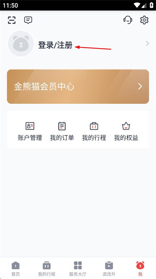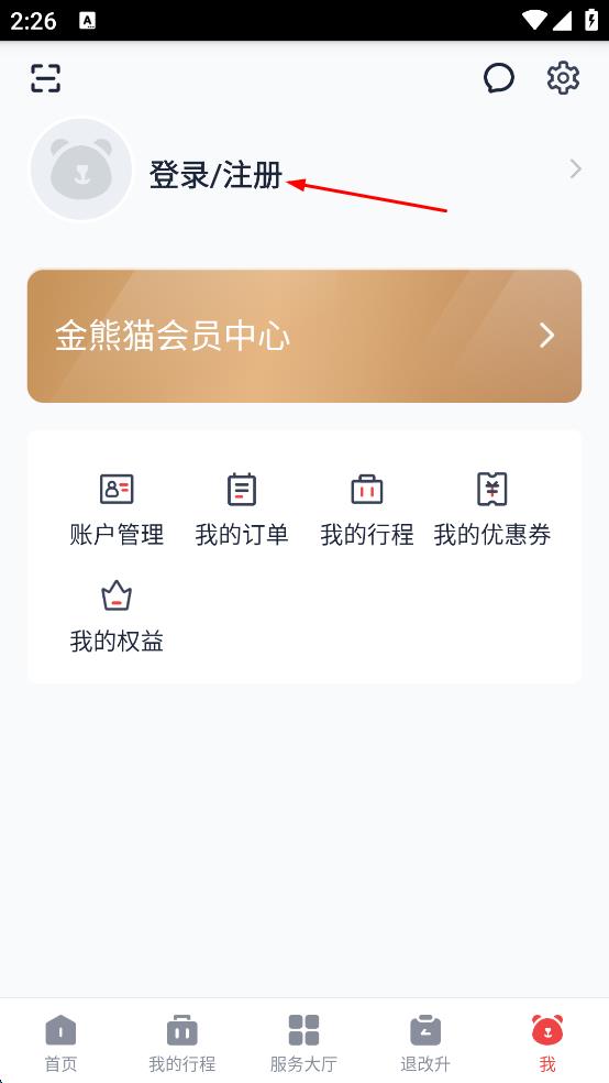 2、在個人中心頁面找到登錄注冊選項并點擊,跳轉(zhuǎn)至歡迎登錄界面。