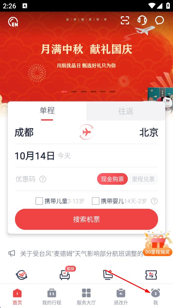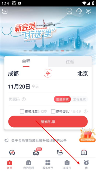 1、打開四川航空APP,點擊底部我,進入個人中心頁面。