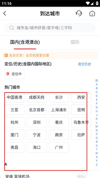 1、選擇到達(dá)城市,可從熱門城市列表中選取。