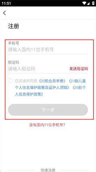 4、在注冊頁面輸入國內(nèi)11位手機號,點擊發(fā)送驗證碼并填入,勾選相關(guān)協(xié)議后點擊下一步。