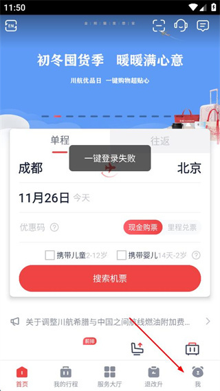 1、打開川航相關(guān)軟件,點擊頁面右下角“我”的選項,進入個人頁面。