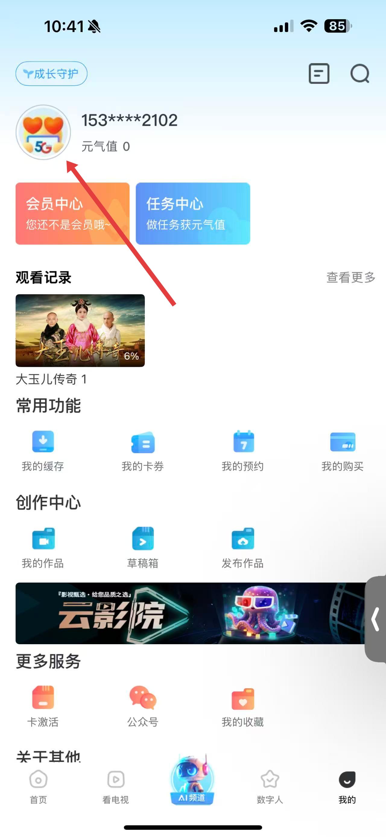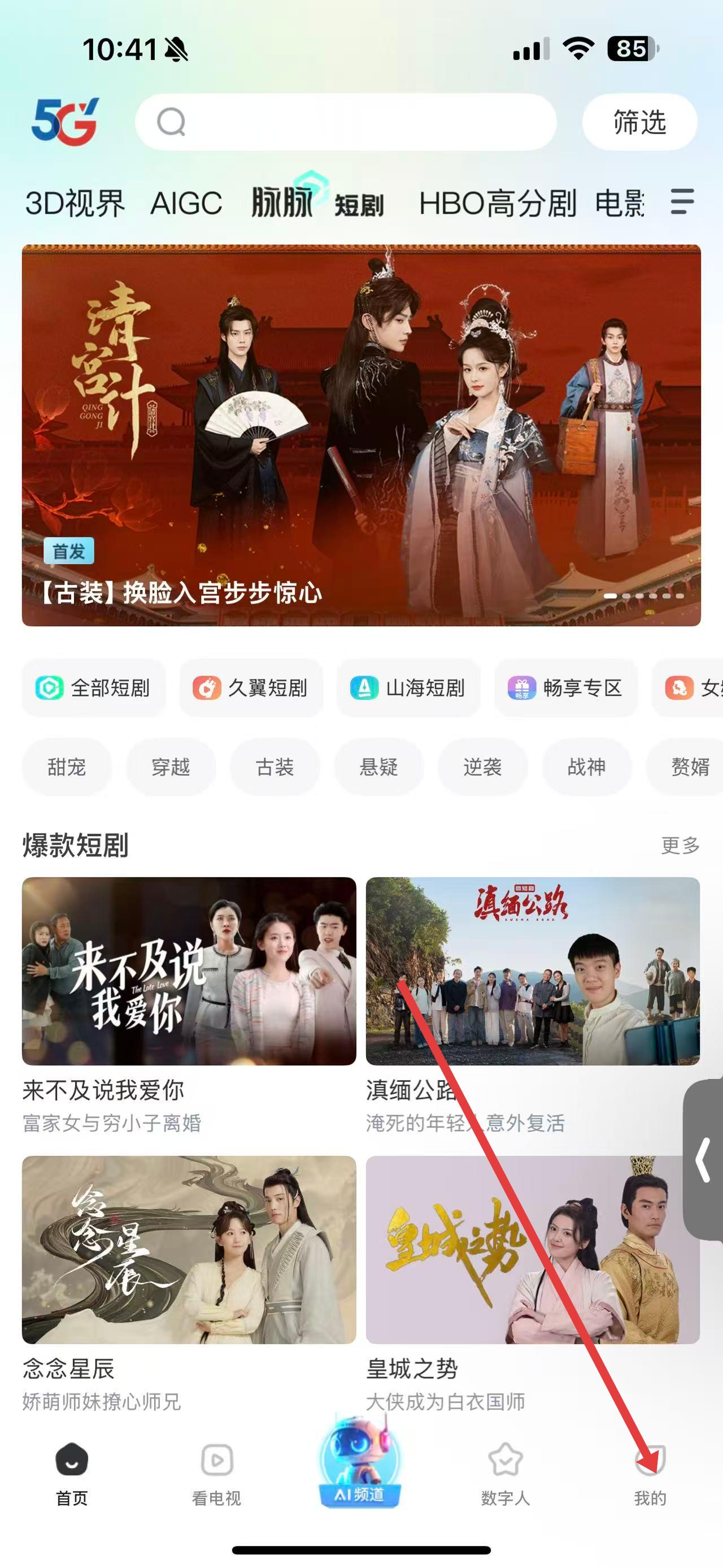 1、打開(kāi)天翼超高清應(yīng)用,點(diǎn)擊底部導(dǎo)航欄最右側(cè)的我的選項(xiàng),進(jìn)入個(gè)人頁(yè)面。