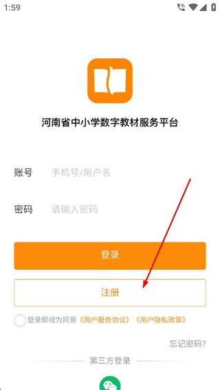1、打開(kāi)河南省中小學(xué)數(shù)字教材服務(wù)平臺(tái),在登錄頁(yè)面點(diǎn)擊注冊(cè)按鈕。