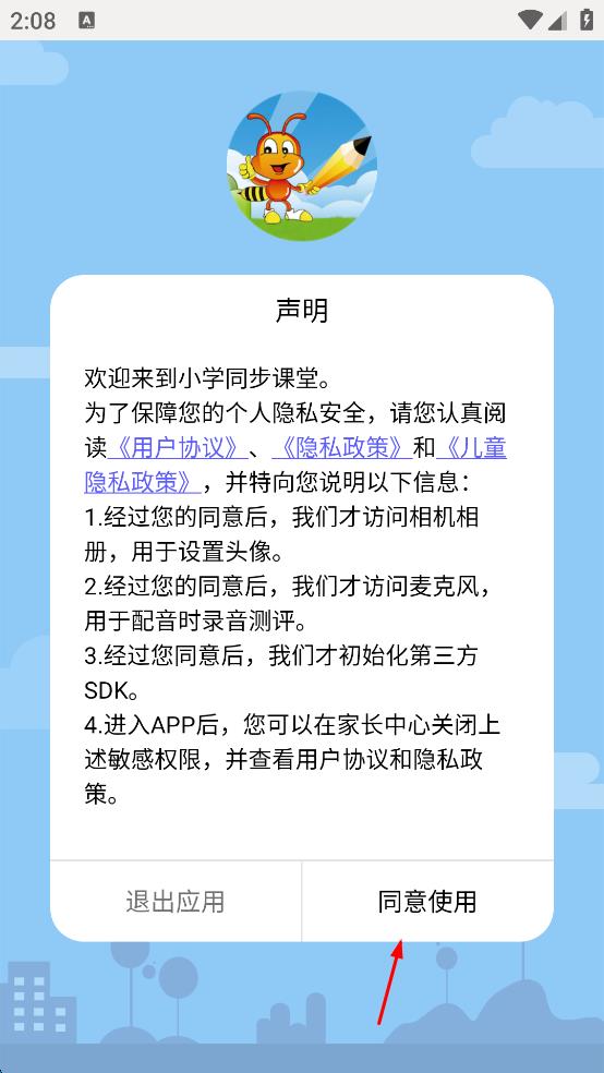 1、打開(kāi)小學(xué)同步課堂APP,在“聲明”彈窗中,點(diǎn)擊“同意使用”,進(jìn)入“我的課程”頁(yè)面。