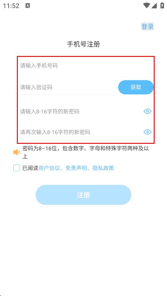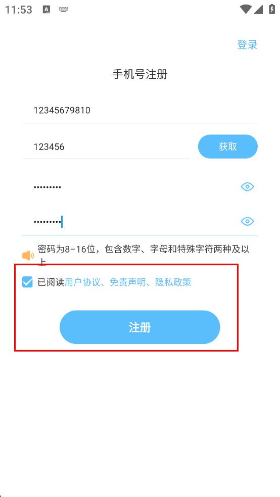 4、勾選“已閱讀用戶(hù)協(xié)議、免責(zé)聲明、隱私政策”,然后點(diǎn)擊藍(lán)色的“注冊(cè)”按鈕。