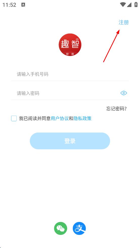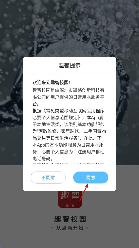 1、打開(kāi)趣智校園APP,在彈出的“溫馨提示”窗口中,點(diǎn)擊“同意”按鈕。