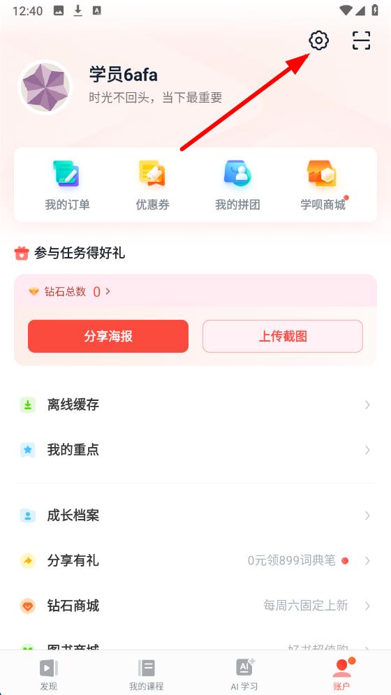 2、進(jìn)入賬戶界面后,點(diǎn)擊右上角齒輪形狀的設(shè)置圖標(biāo)進(jìn)入設(shè)置頁(yè)面。