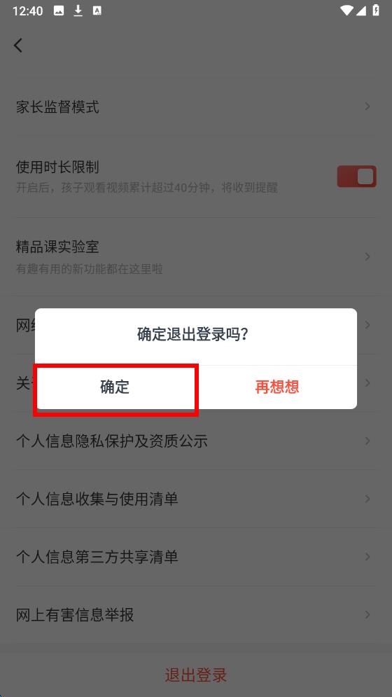 4、在彈出的確定退出登錄的確認(rèn)彈窗中,點(diǎn)擊確定按鈕即可完成退出登錄操作。