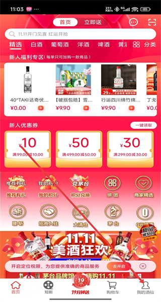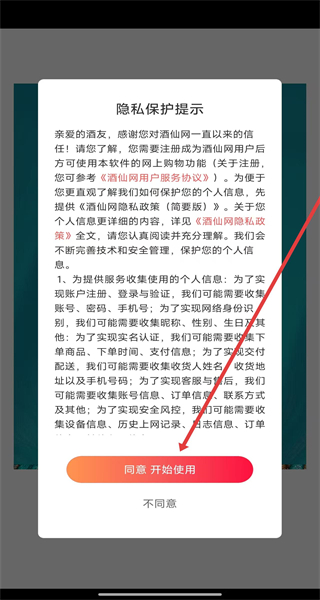 1、點擊“隱私保護提示”彈窗的“同意開始使用”,進入酒仙網(wǎng)APP主界面。