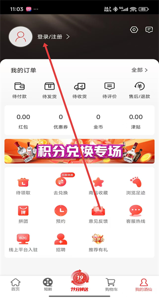 3、個人中心頁面點擊“登錄/注冊”,進入登錄界面。