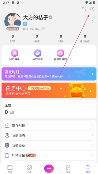 2、在個人頁面中,點擊右上角的設(shè)置圖標(biāo),進(jìn)入設(shè)置界面。