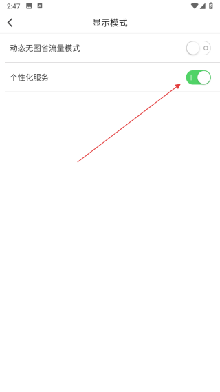 4、在顯示模式設(shè)置頁面,找到個性化服務(wù)對應(yīng)的開關(guān)按鈕,點擊該開關(guān)按鈕。