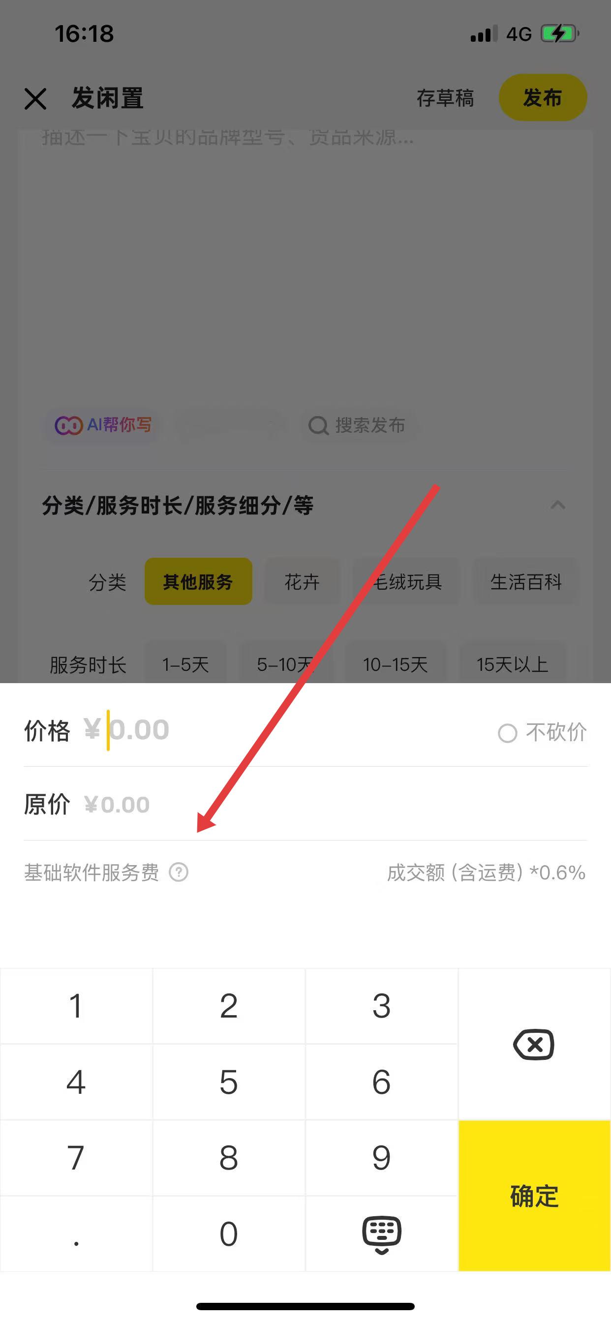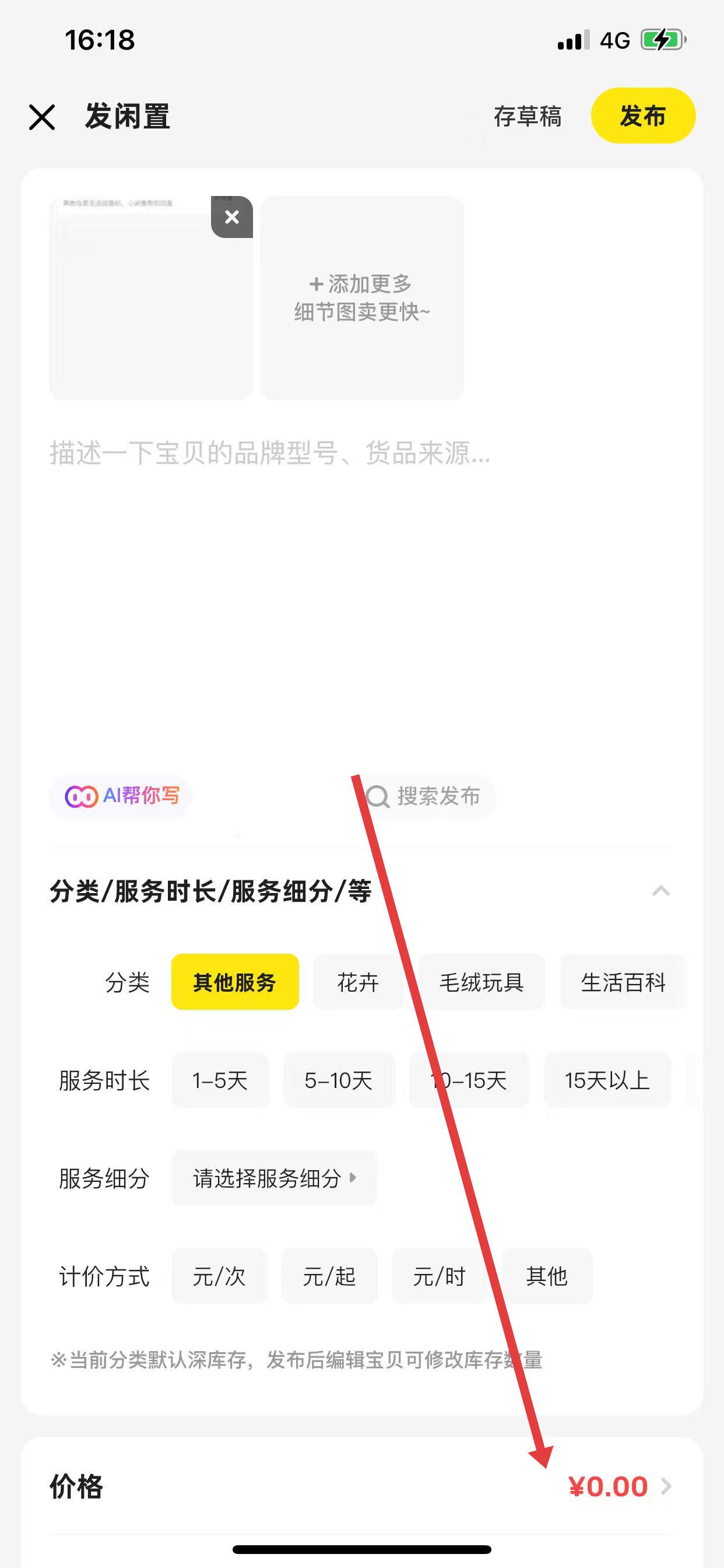 2、在發(fā)閑置頁面,完成商品圖片添加、商品描述等信息填寫,接著點(diǎn)擊價(jià)格選項(xiàng),進(jìn)入價(jià)格設(shè)置界面。