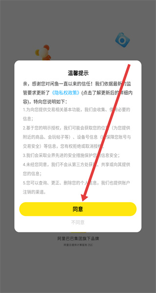 1、打開閑魚APP,彈出溫馨提示窗口,點(diǎn)擊同意后進(jìn)入。