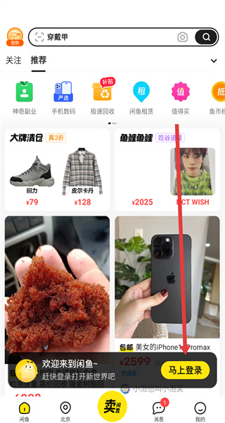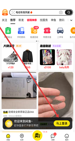 1、在閑魚主頁中,點(diǎn)擊馬上登錄按鈕,準(zhǔn)備展開登錄操作。