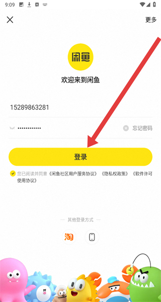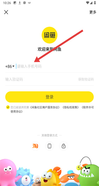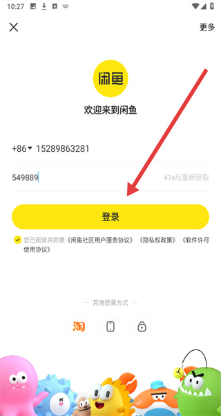 4、將收到的驗(yàn)證碼填入“輸入驗(yàn)證碼”框內(nèi),勾選已閱讀并同意相關(guān)協(xié)議后,點(diǎn)擊登錄按鈕,完成閑魚APP的登錄流程。