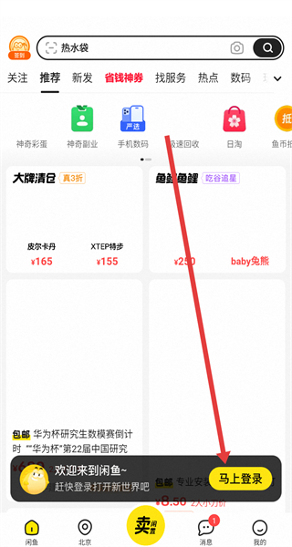 2、進(jìn)入閑魚首頁后,點(diǎn)擊首頁彈出的“馬上登錄”,進(jìn)入登錄界面。