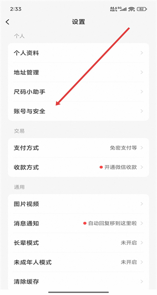 1、可以在閑魚設(shè)置頁面中,點(diǎn)擊賬號與安全選項(xiàng),進(jìn)入查看相關(guān)功能設(shè)置。