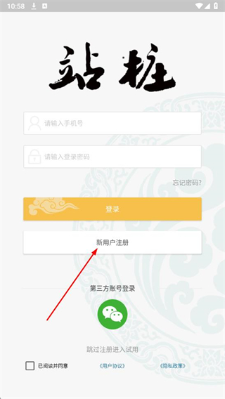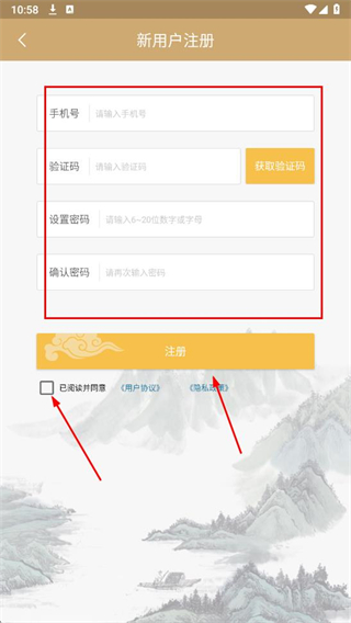 4、進(jìn)入新用戶注冊(cè)頁面,輸入手機(jī)號(hào)等,勾選用戶協(xié)議,點(diǎn)擊注冊(cè)。