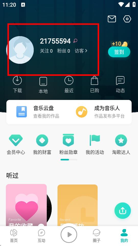 1、打開(kāi)5sing音樂(lè)APP進(jìn)入我的界面,點(diǎn)擊上方個(gè)人頭像區(qū)域進(jìn)入個(gè)人主頁(yè)。