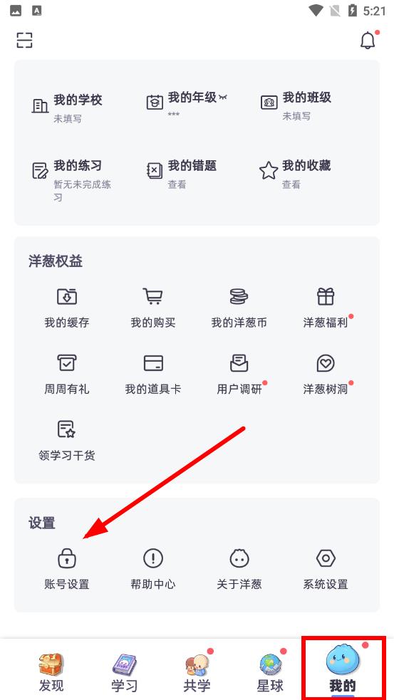 1、打開洋蔥學園APP點擊最右側(cè)我的按鈕進入個人中心頁面,在設置板塊里點擊賬號設置選項。