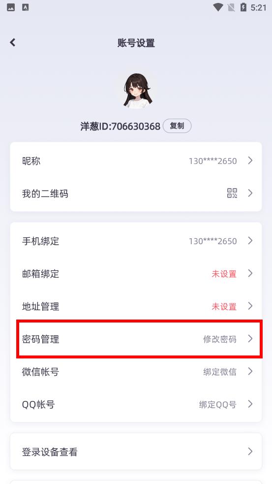 2、在賬號設置界面中找到密碼管理選項并點擊進入密碼修改流程。