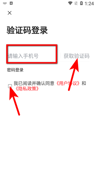 3、在驗證碼登錄頁面,輸入手機(jī)號,勾選用戶協(xié)議與隱私政策,點擊獲取驗證碼。