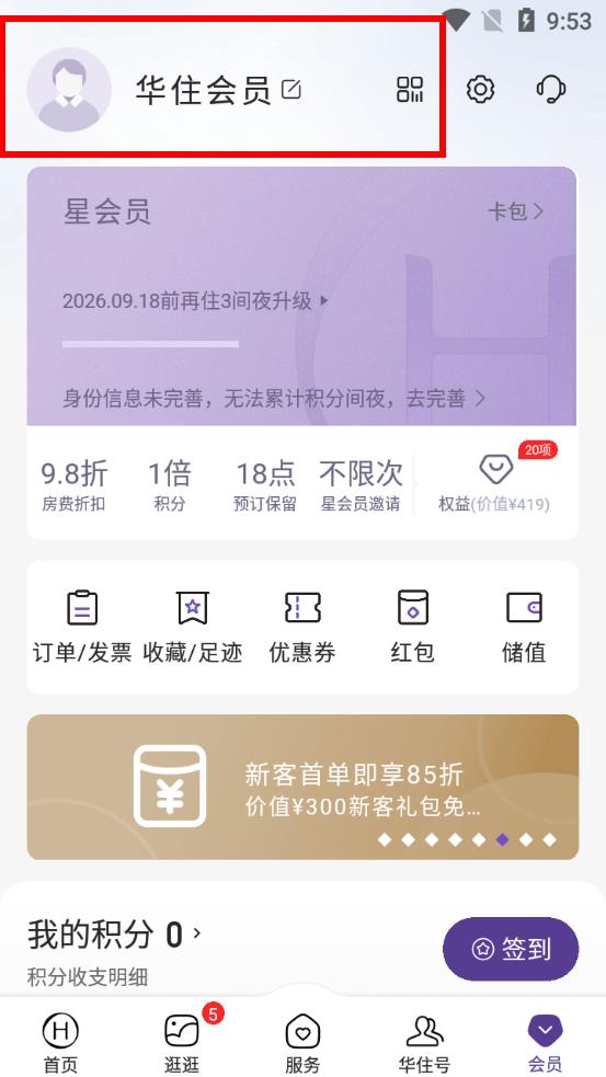 2、在會(huì)員界面,點(diǎn)擊華住會(huì)員區(qū)域進(jìn)入我的賬戶界面。