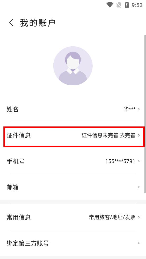3、在我的賬戶界面中找到證件信息欄,點(diǎn)擊去完善進(jìn)入完善證件信息界面。
