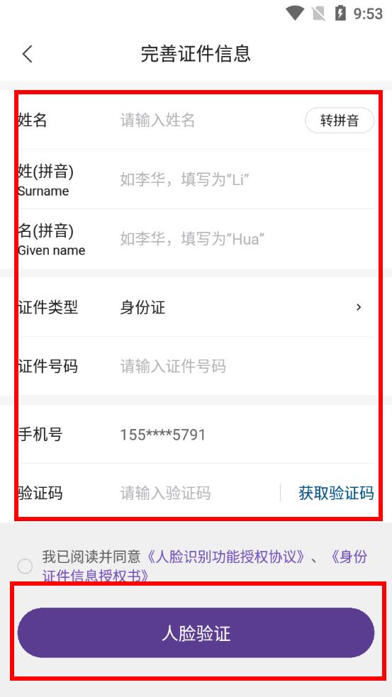 4、在完善證件信息界面,依次填寫(xiě)信息,填寫(xiě)完成后獲取并輸入驗(yàn)證碼,勾選同意相關(guān)協(xié)議后點(diǎn)擊人臉驗(yàn)證,按提示完成實(shí)名認(rèn)證操作。