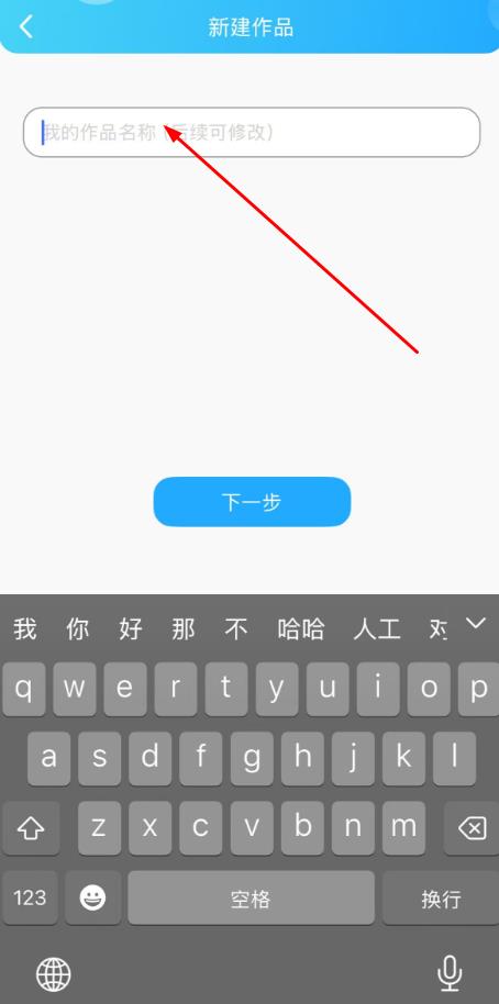3、登錄后進入新建作品頁面,在頂部輸入框提示文字我的作品名稱后續(xù)可修改中填寫作品名稱,點擊下方藍色下一步按鈕,啟動作品創(chuàng)建流程。