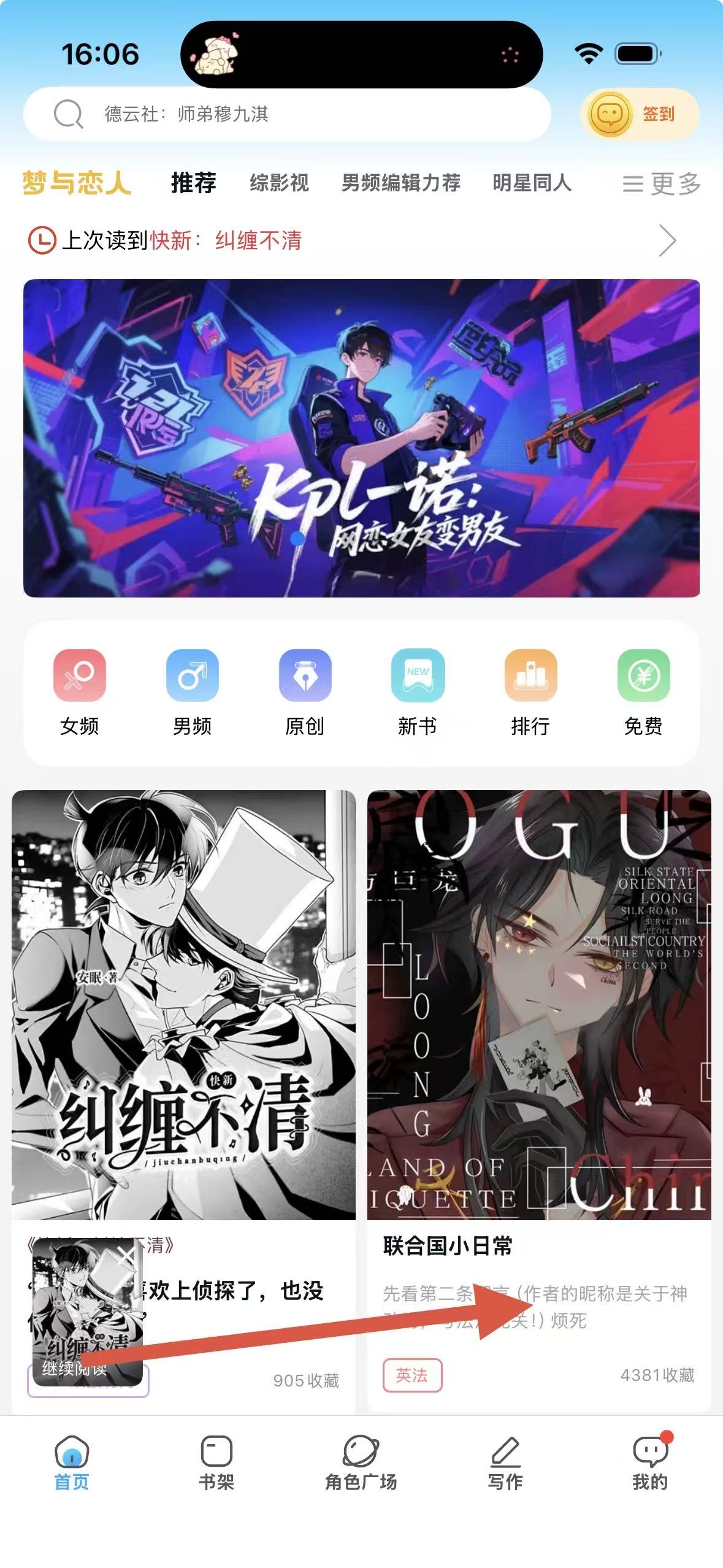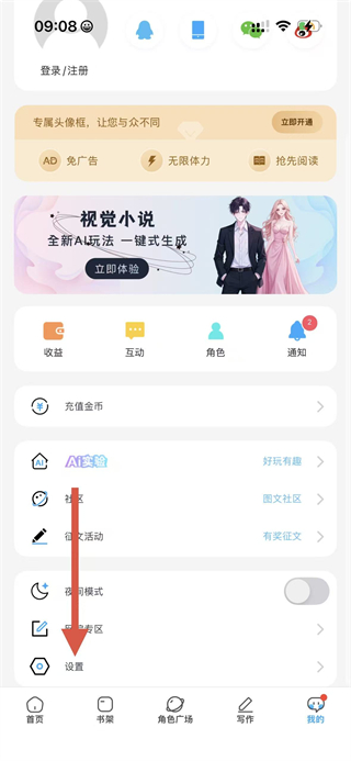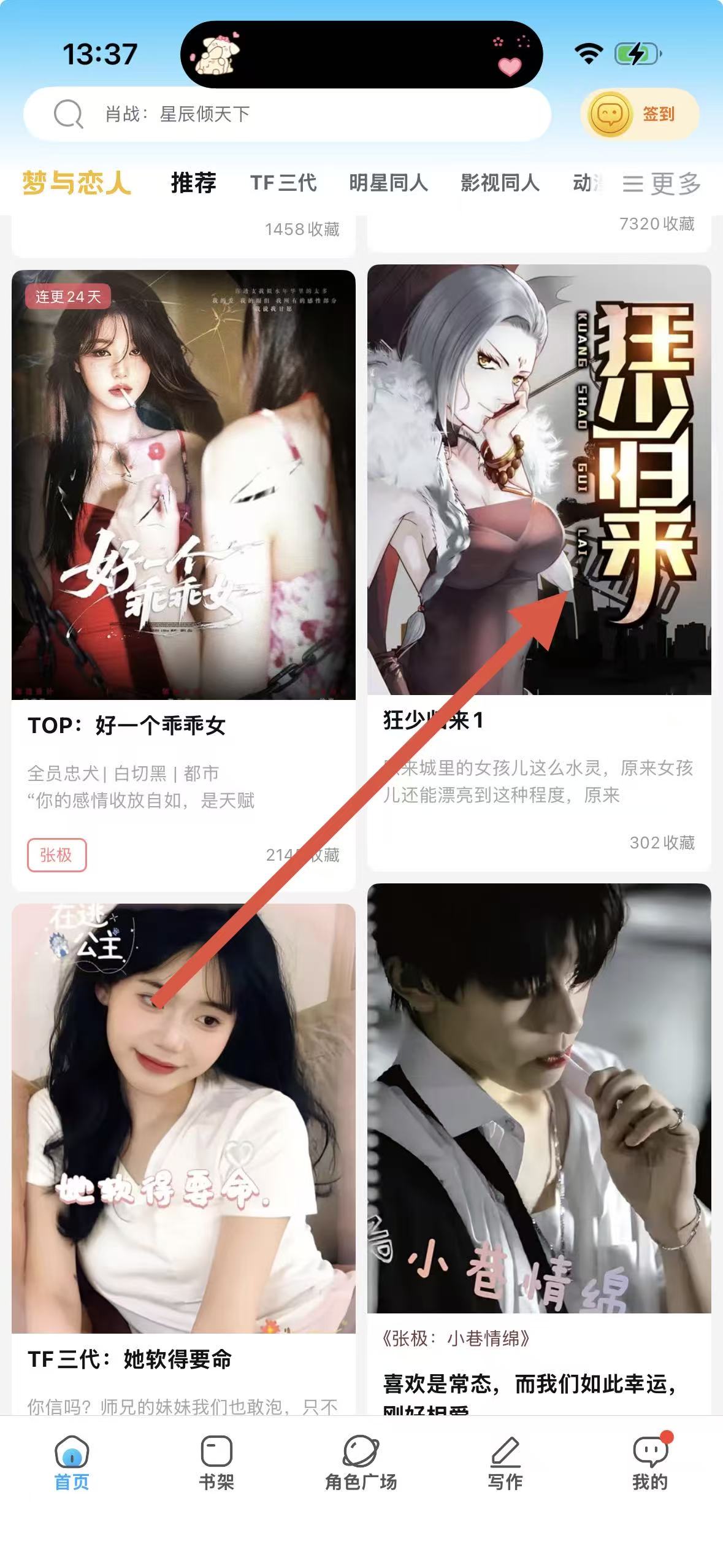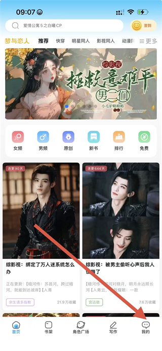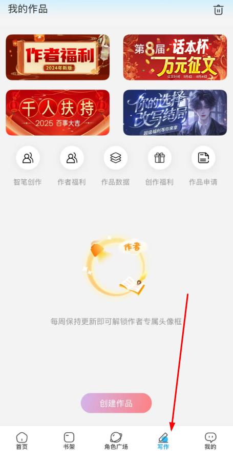 1、在APP底部導(dǎo)航欄點擊寫作圖標,進入我的作品頁面,頁面頂部展示作者福利,話本杯征文等活動下方設(shè)智筆創(chuàng)作作者福利等功能入口。