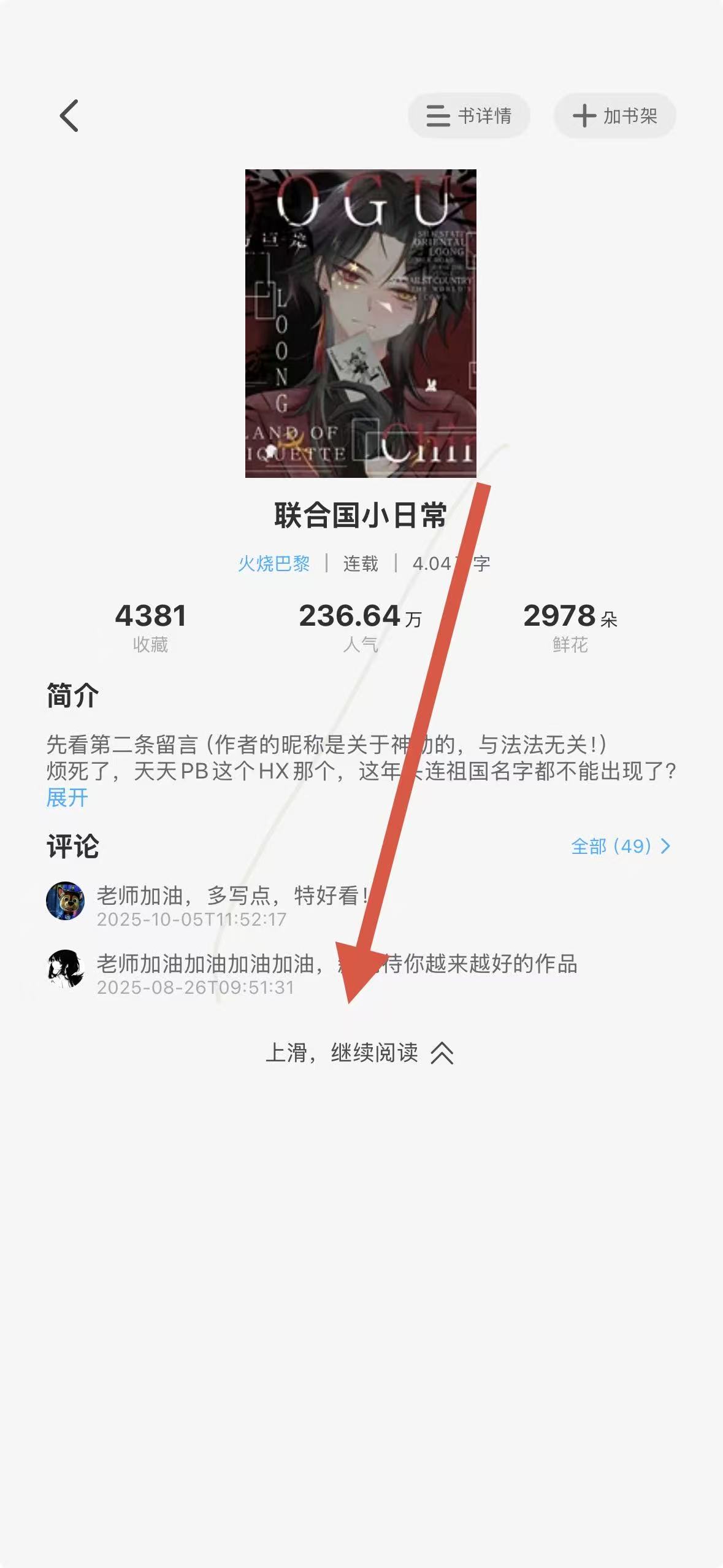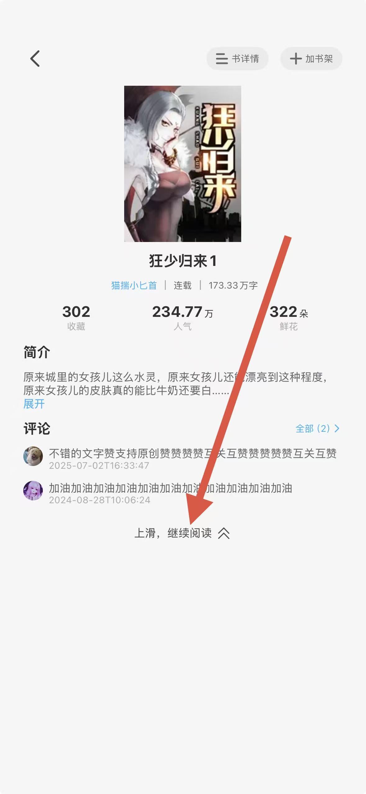 2、在小說詳情頁面,點擊上滑繼續(xù)閱讀選項,進入小說閱讀界面。