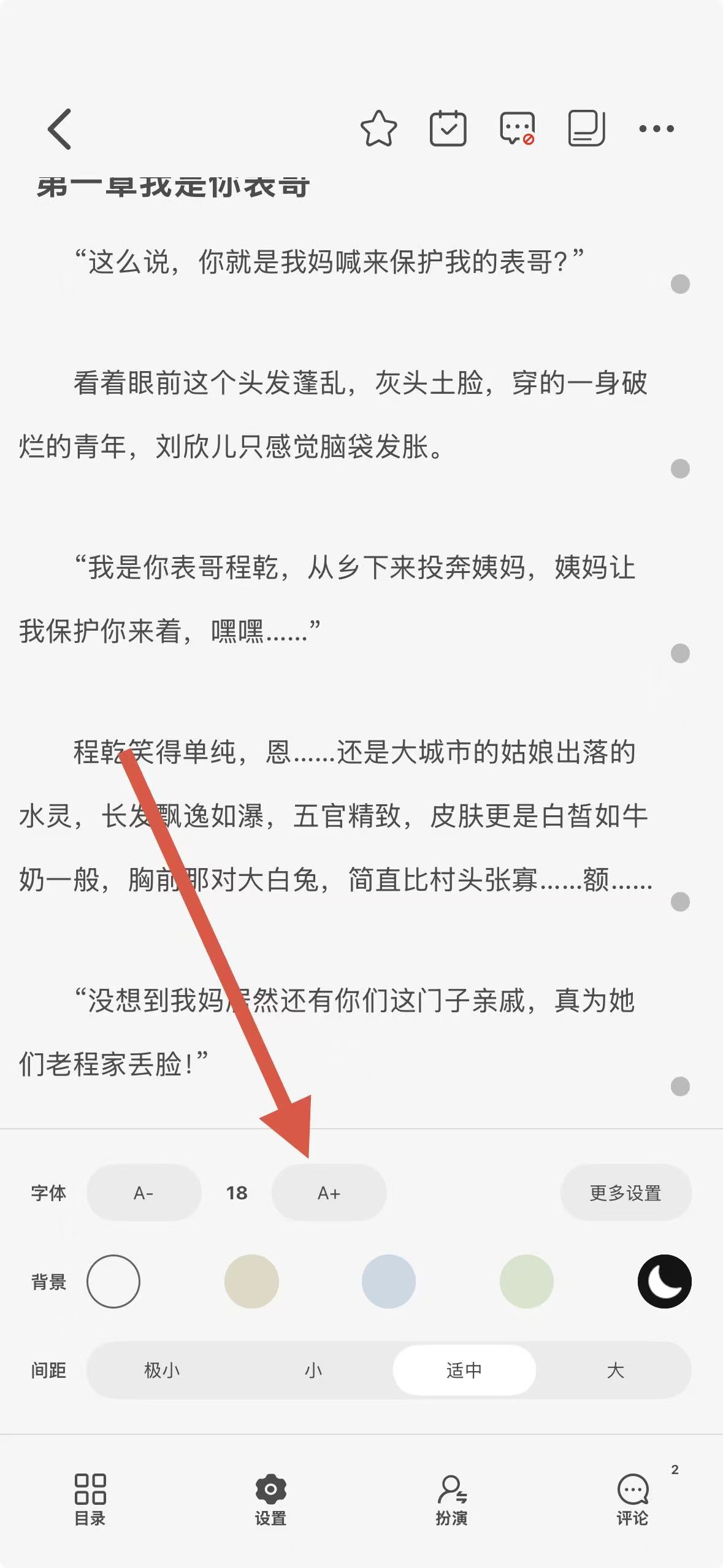 4、在設(shè)置菜單中,找到字體區(qū)域,點擊A-或A+按鈕,即可調(diào)整字體大小。