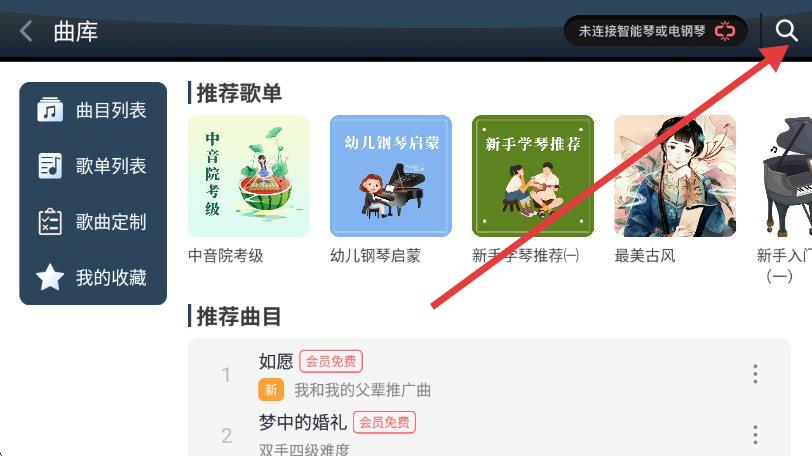 2、在曲譜頁面點擊右上角的搜索按鈕,搜索需要收藏的曲譜。