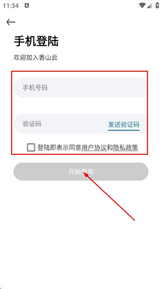 3、輸入手機號碼、驗證碼,勾選協(xié)議,點擊開始使用。