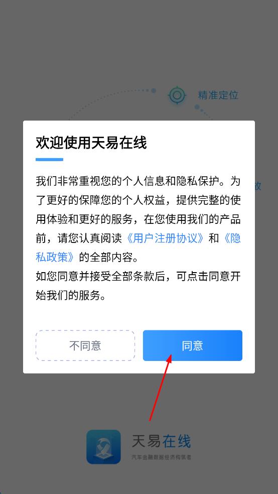 1、打開(kāi)天易在線(xiàn)APP,在隱私協(xié)議彈窗中點(diǎn)擊“同意”按鈕。